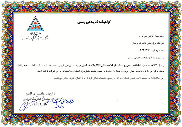شرکت برق سان تجارت پایدار نمایندگی کابل افشارنژاد خراسان در تهران می باشد. این شرکت با پخش سیم و کابل خراسان به صورت عمده در سرتاسر ایران نیاز بازار داخلی را تامین می نماید. شرکت کابل خراسان علاوه بر اعطای نمایندگی کابل افشار نژاد در تهران در سایر شهرها نیز نمایندگی های رسمی خود را دارد. در صورت خرید سیم و کابل از نمایندگی رسمی شرکت سیم و کابل خراسان، امکان ضمانت محصولات فروخته شده وجود دارد در غیر این صورت شرکت و نمایندگان خراسان هیچ مسئولیتی را در قبال فروش محصولات تقلبی خراسان و یا نمونه هایی با نام مشابه بر عهده این شرکت نخواهد بود.